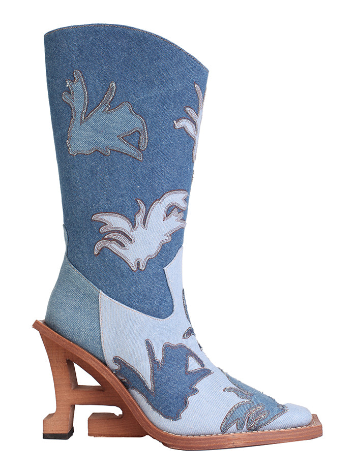 Description: Introducing a new silhouette with the Bhana Cowboy boot made from tonal patchwork denim....