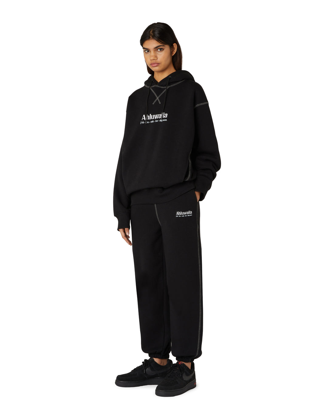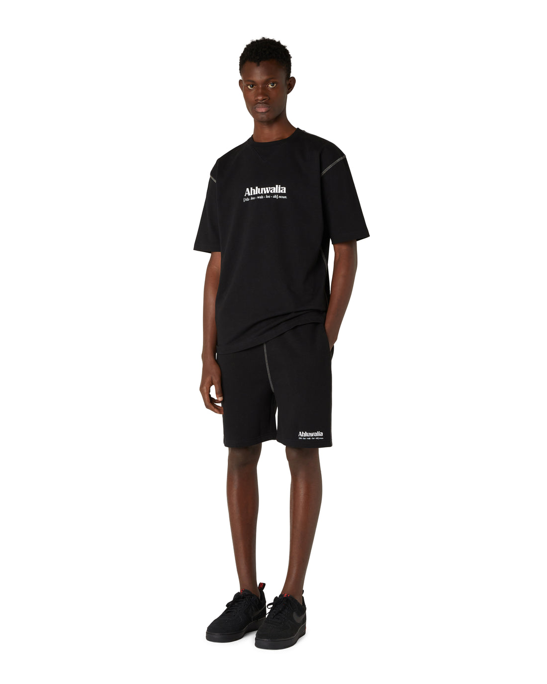 Description: The Laili knitted mini skirt features a trompe-l'œil wrap detail, highlighted with an 'Ahluwalia'...