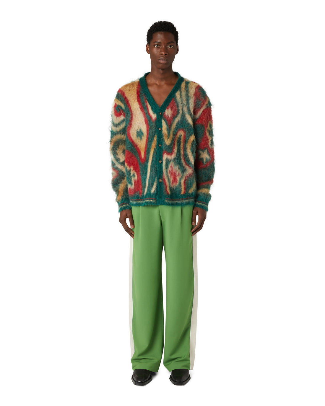 Description: The Ongoye Knit Cardigan features a vivid and striking pattern crafted in sumptuous mohair...