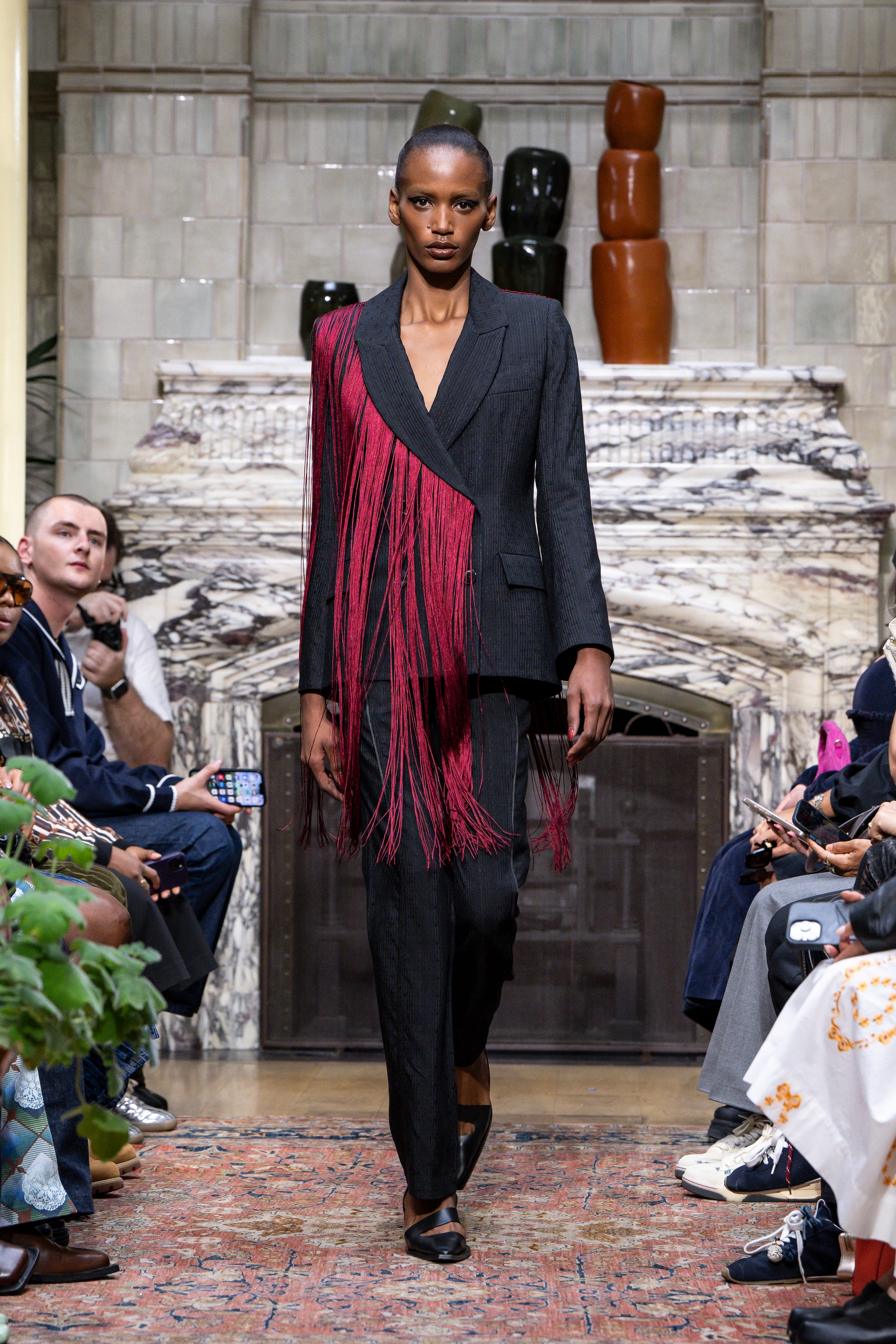Ahluwalia’s renowned graphic theme of stripes, diagonal lines and curved detailing.