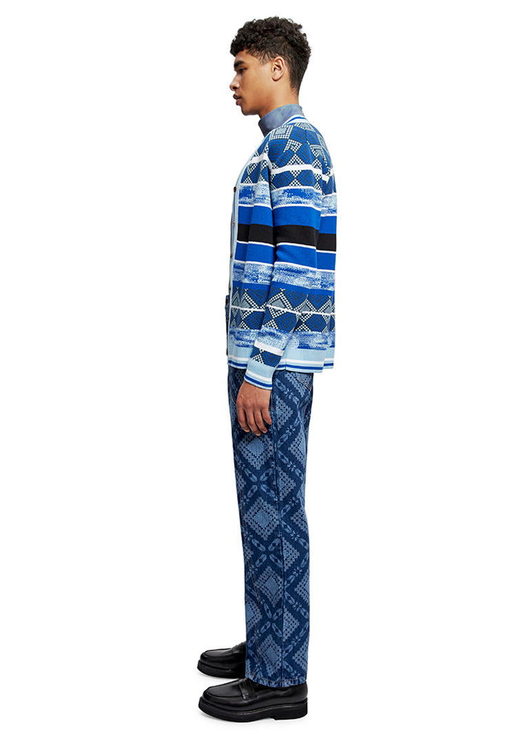 Knit from 100% pure merino wool, this new shape for AW22 features a graphic yet relaxed and textured pattern. The v-neck cardigan is accented with a ribbed hem, cuffs and sable buttons.