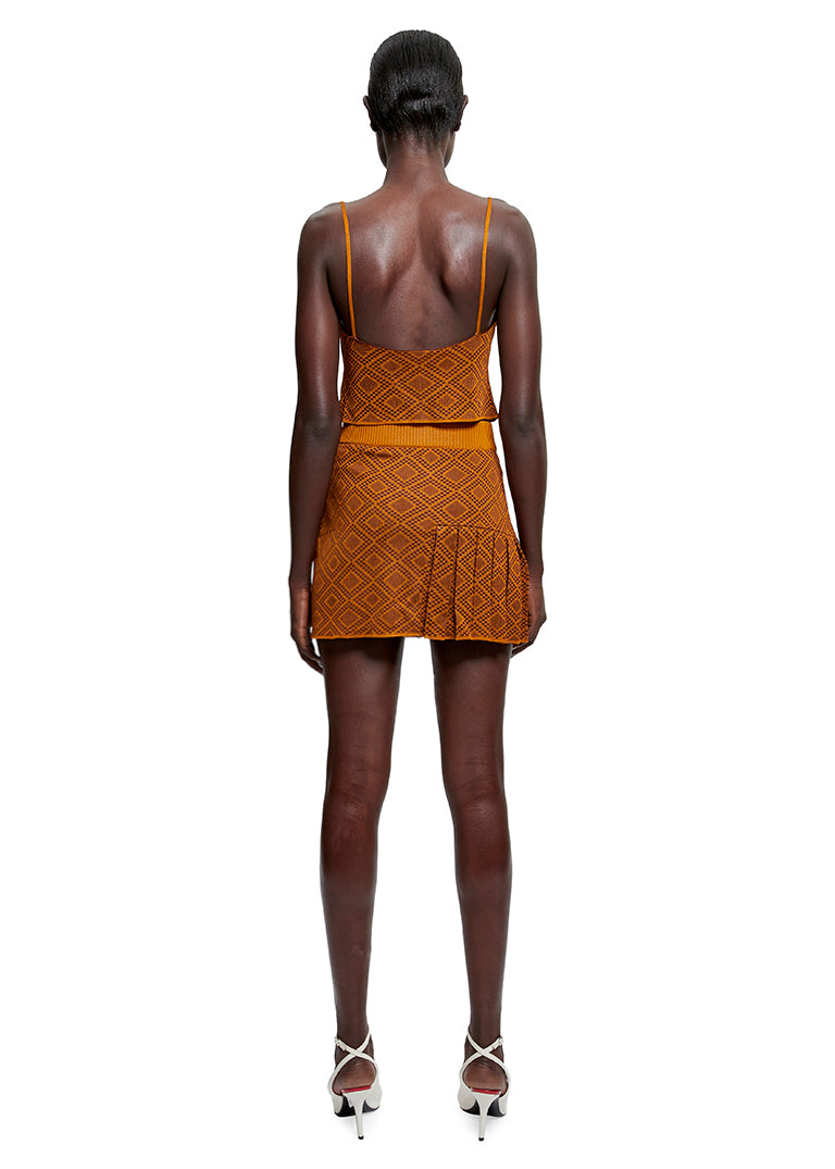 Knitted from sporty viscose in a custom Ahluwalia jacquard pattern, the Ojewale mini skirt is characterised by autumnal shades of rusty brown for a distinct and seasonal finish with a ribbed hem and front pleating detail.