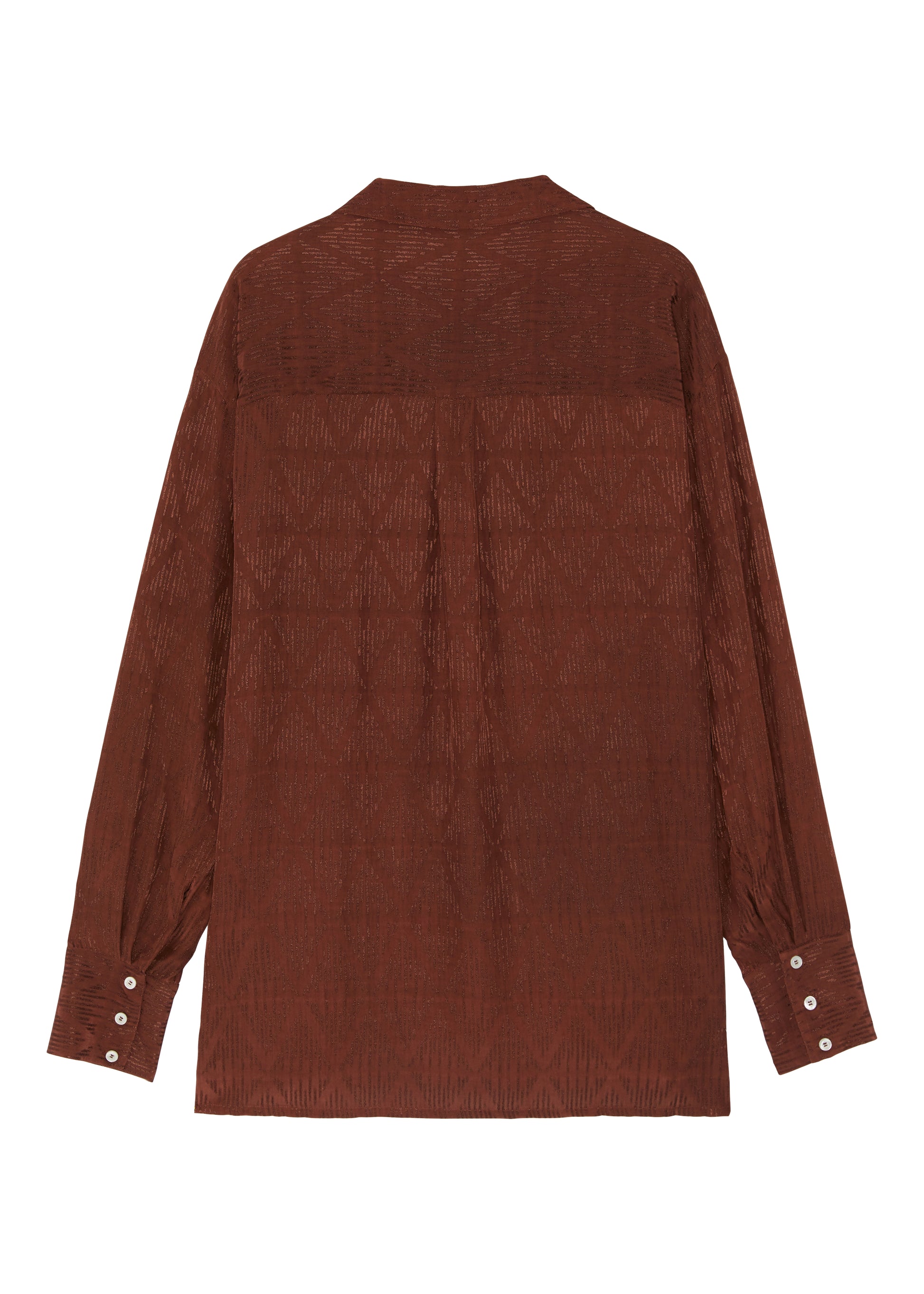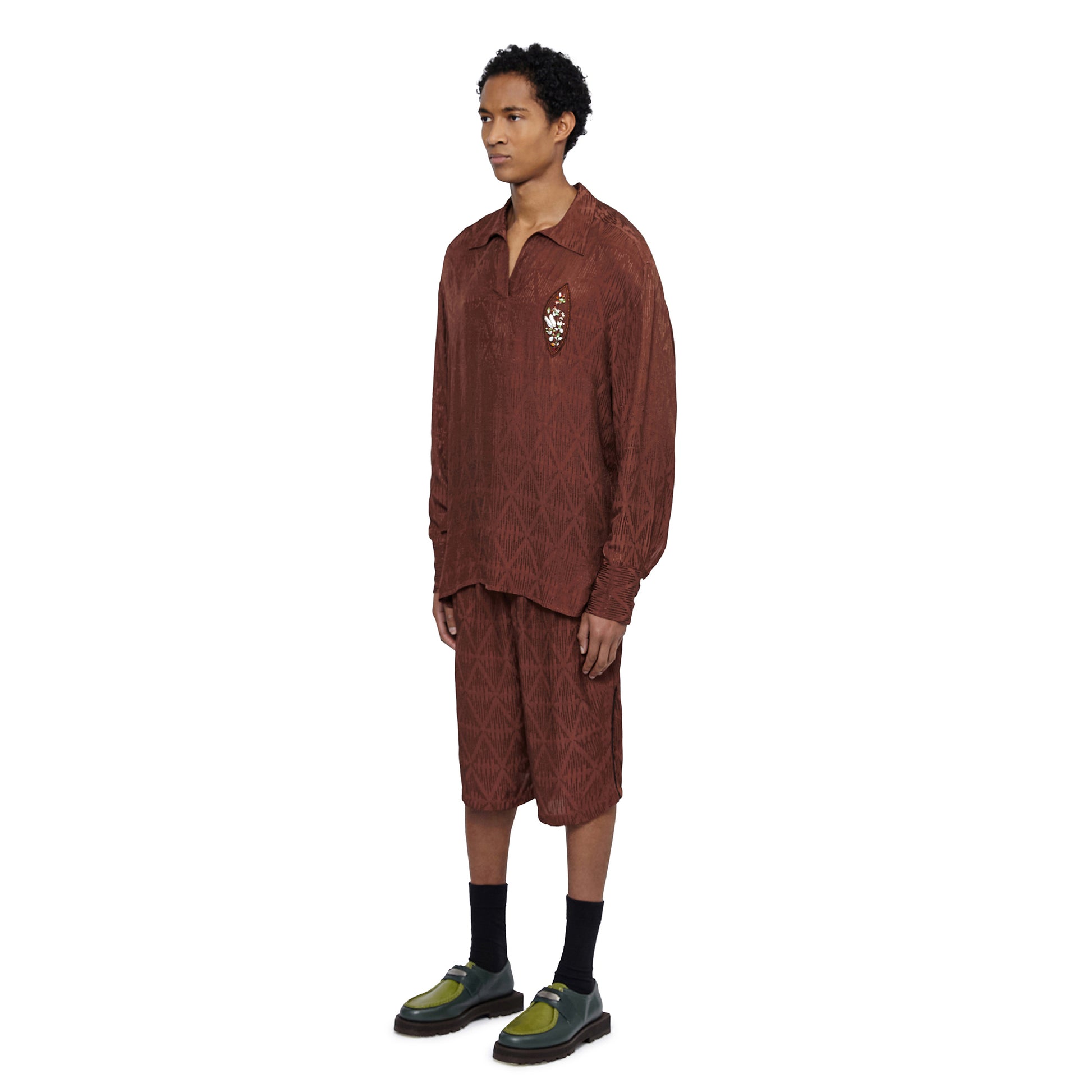 For this season, the Bnaebi embellished top is in a rich brown hue and made from textured repurposed viscose fabric. The centrepiece of the design is an intricate embellishment on the chest, shaped by dual rows of seed beads to form almond motifs. Delicate internal detailing of gems, pearls, and sequins are artfully arranged in patterns inspired by the enchanting fairytales from the collection research.