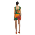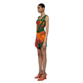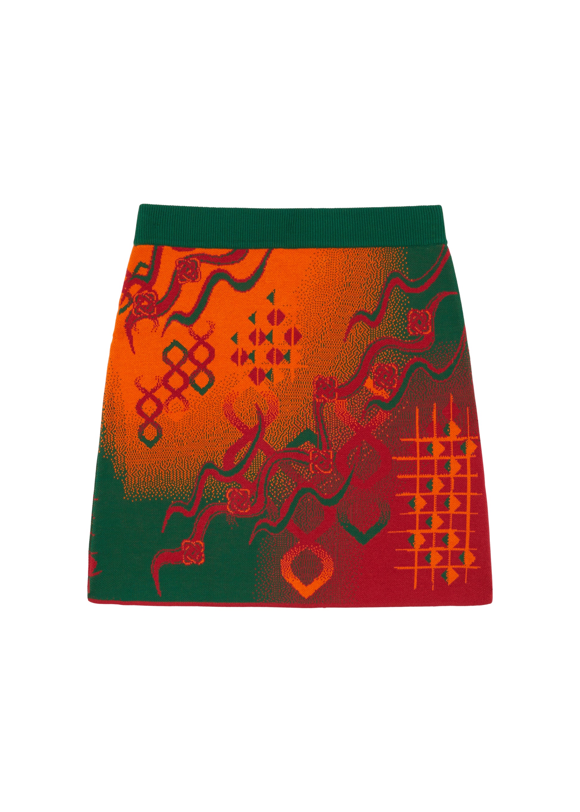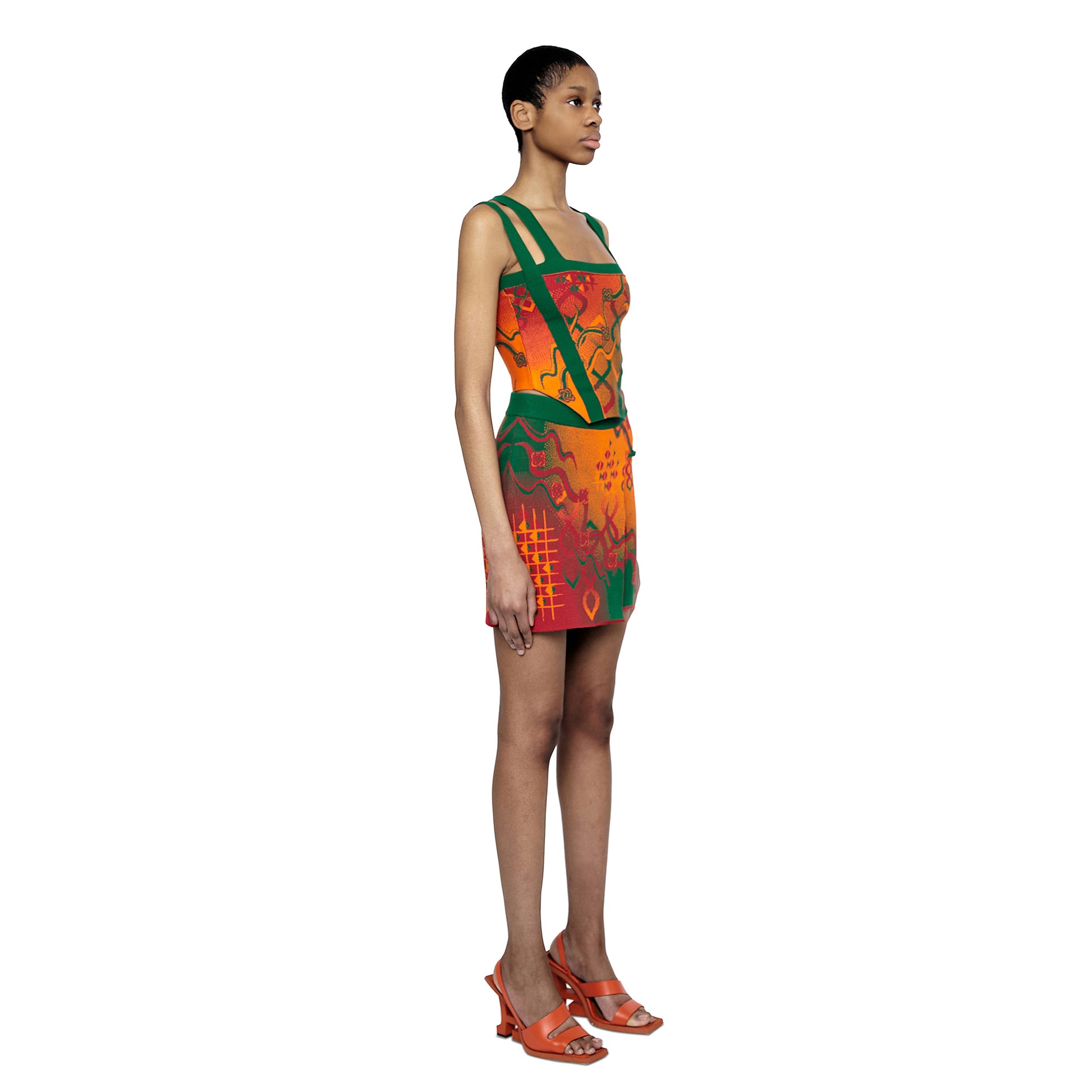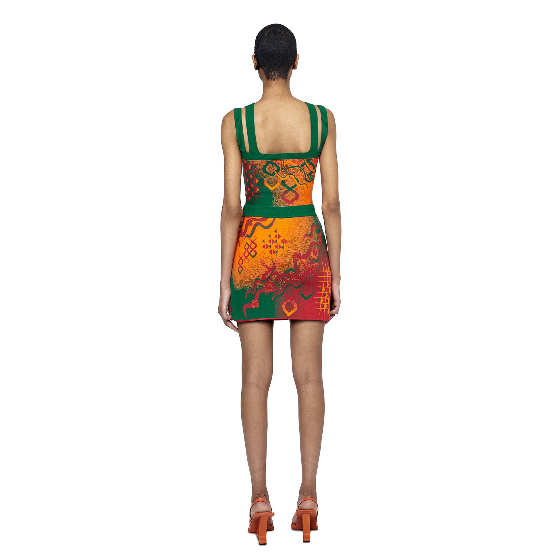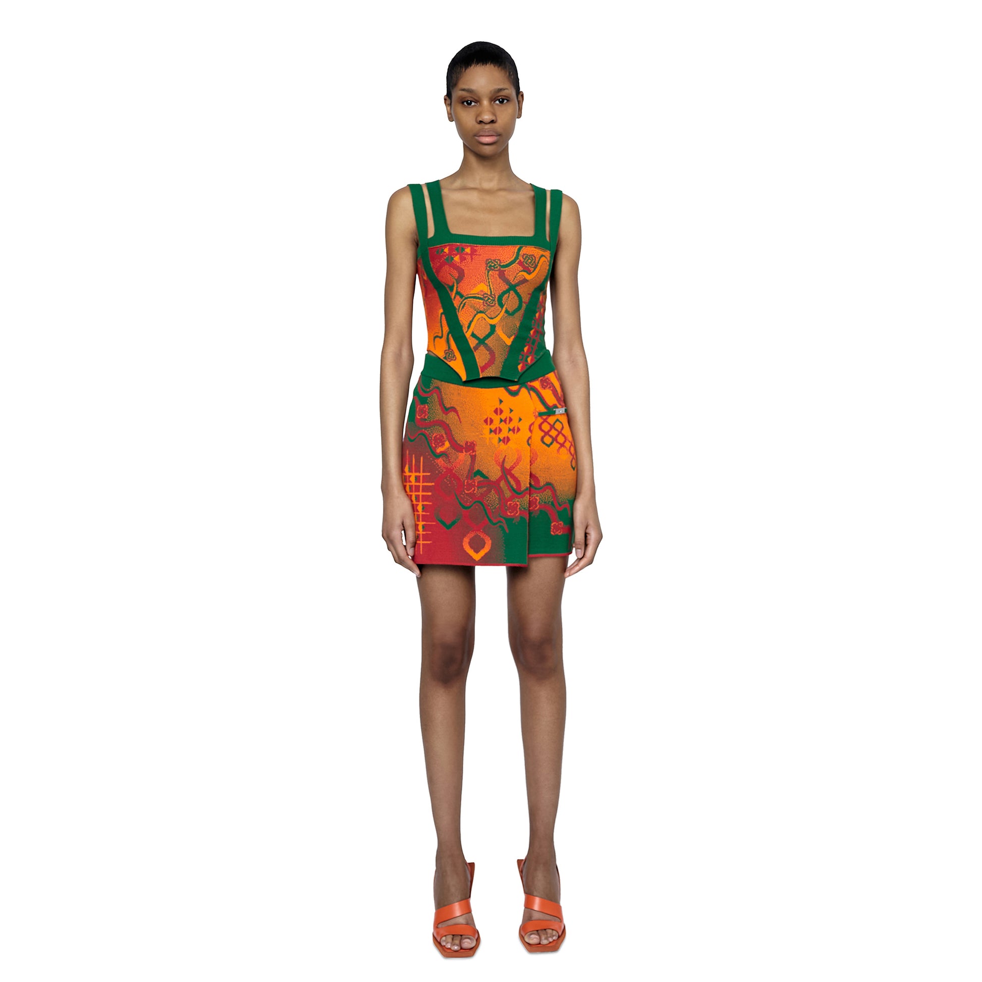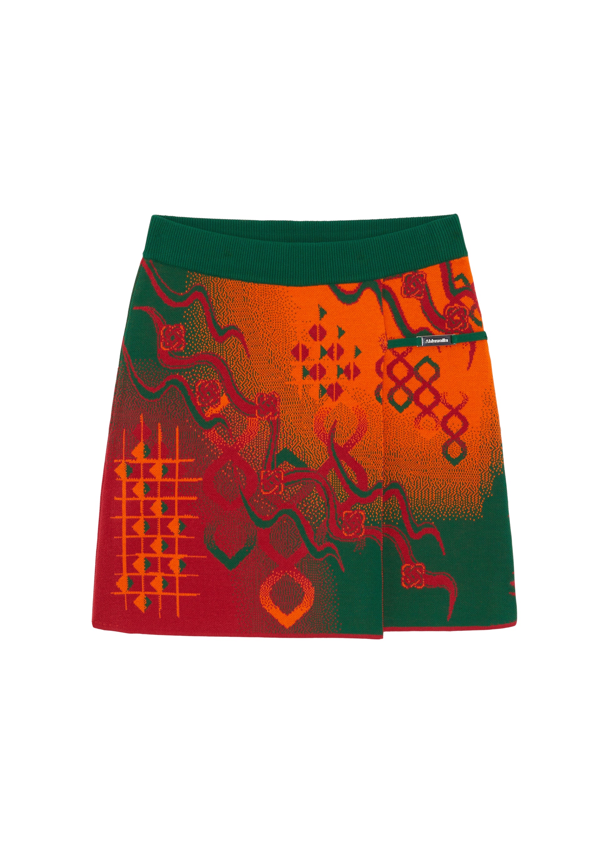The Laili knitted mini skirt features a trompe-l'œil wrap detail, highlighted with an 'Ahluwalia' branded metal tab. The all-over print is inspired by the mystical, fluid elements of storytelling and motifs taken from symbols found on traditional dresses. Made in rust, orange and green colourway from Ecovero viscose, a sustainable yarn made from lenzing.