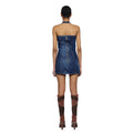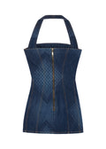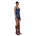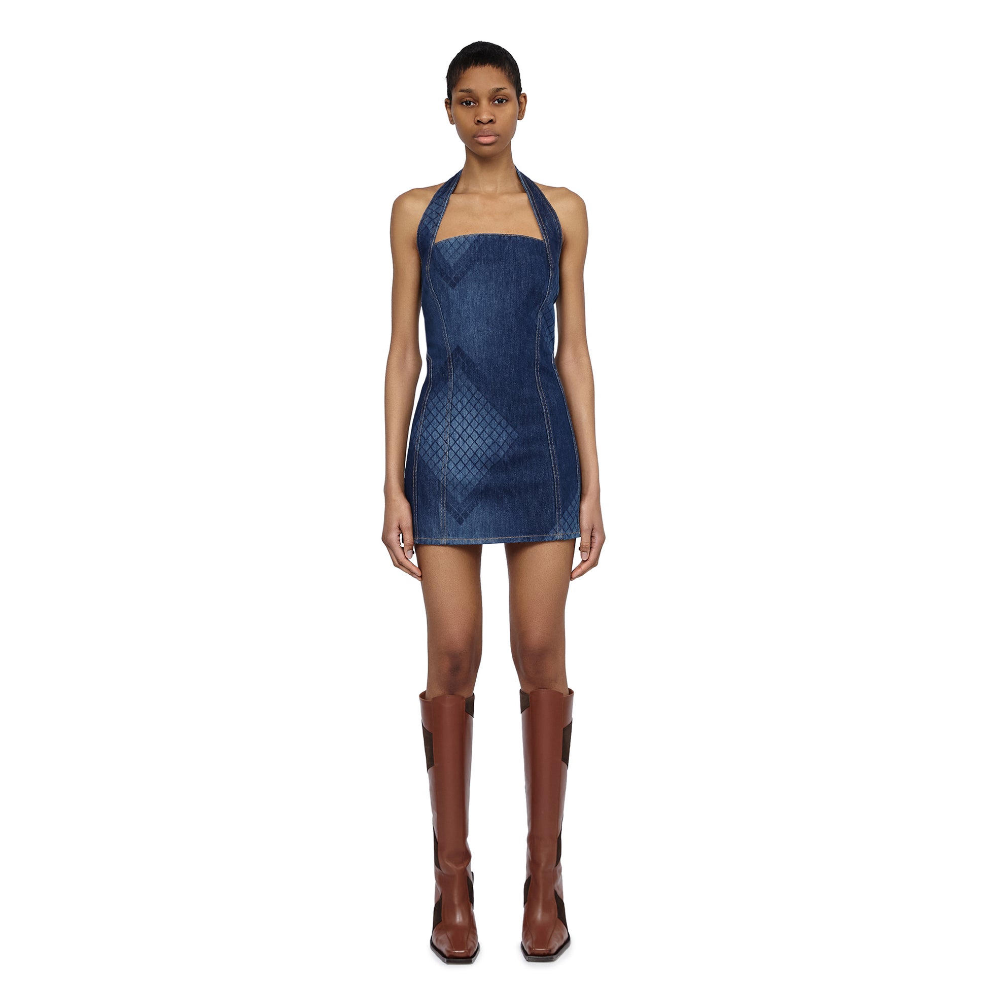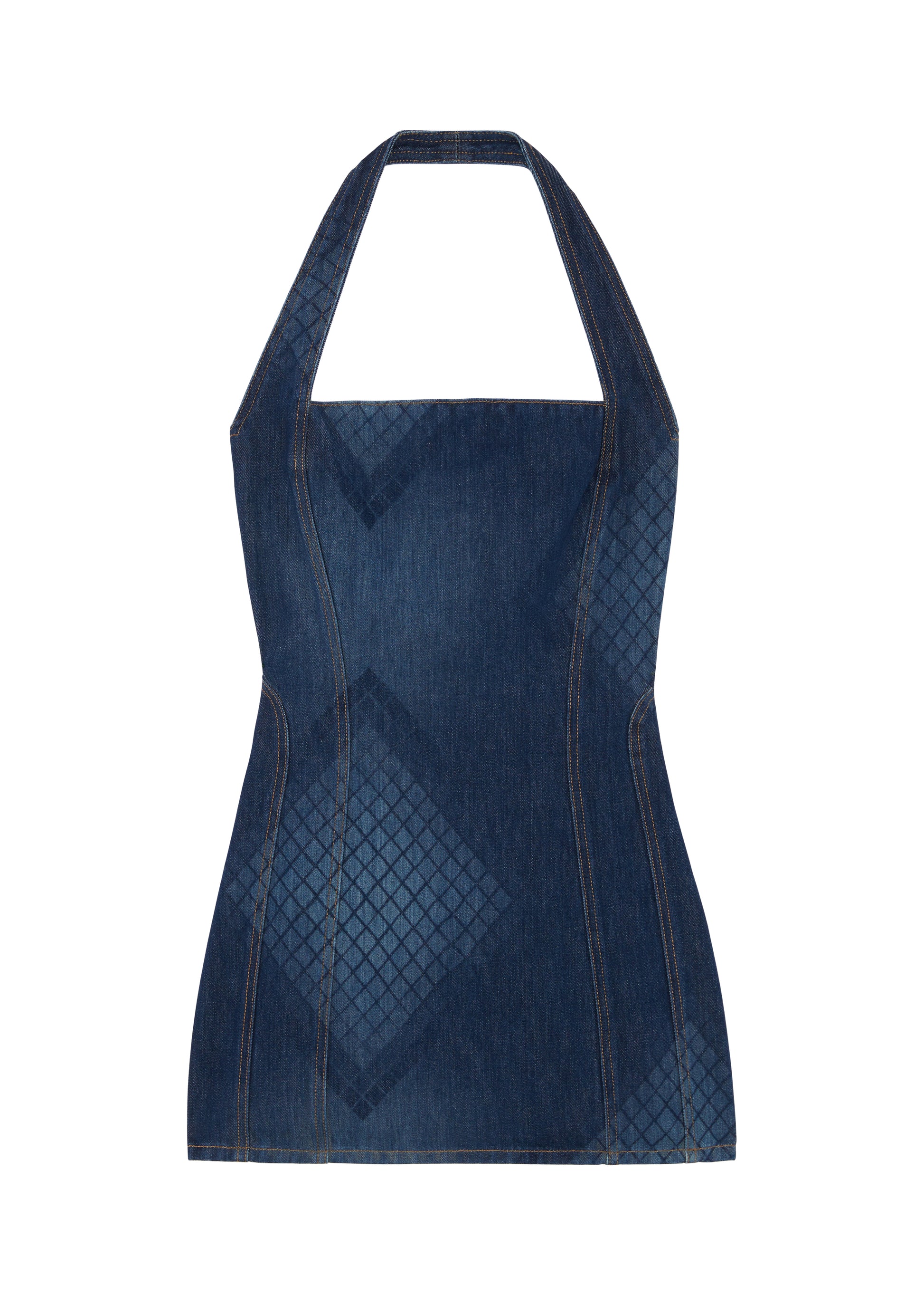 The Laser denim mini dress is lasered with a fading diamond print inspired by tapestries featuring Phulkari, the Indian embroidery style that is local to the Punjab state in India, the fading diamonds create depth to the denim. This halter dress is made from Isko denim, denim that is made from recycled and repurposed materials.