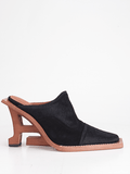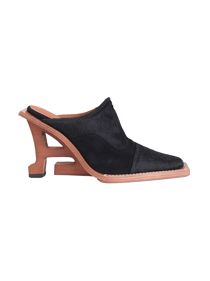 The Bhana mule heels are made in a tonal black. The heel is designed with the signature ‘A’ logo elevating the style featuring a panel that wraps around the front foot with a patchwork designed with leather and pony hair.