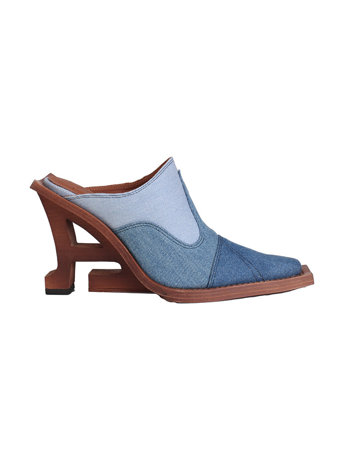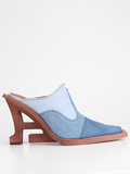 The Bhana mule heels are made from denim in a tonal blue. The heel is designed with the signature ‘A’ logo elevating the style featuring a panel that wraps around the front foot with a patchwork design.