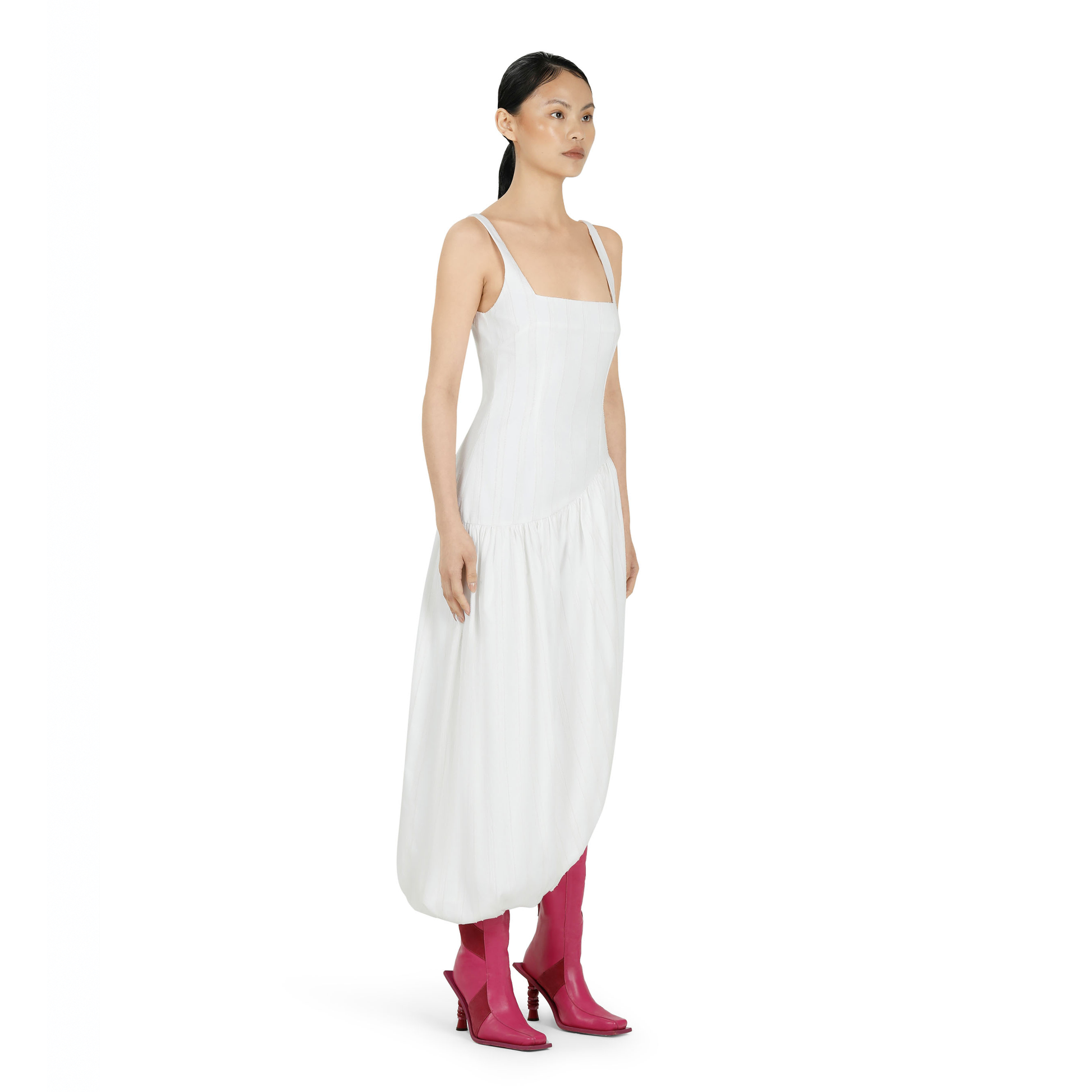 Featuring a square neckline and fitted bodice, the Diana Dress curves into a dropped waistline that flows into an asymmetrical, voluminous skirt. Made from striped off-white cotton, it moves effortlessly and is designed to transition from day to night with ease.