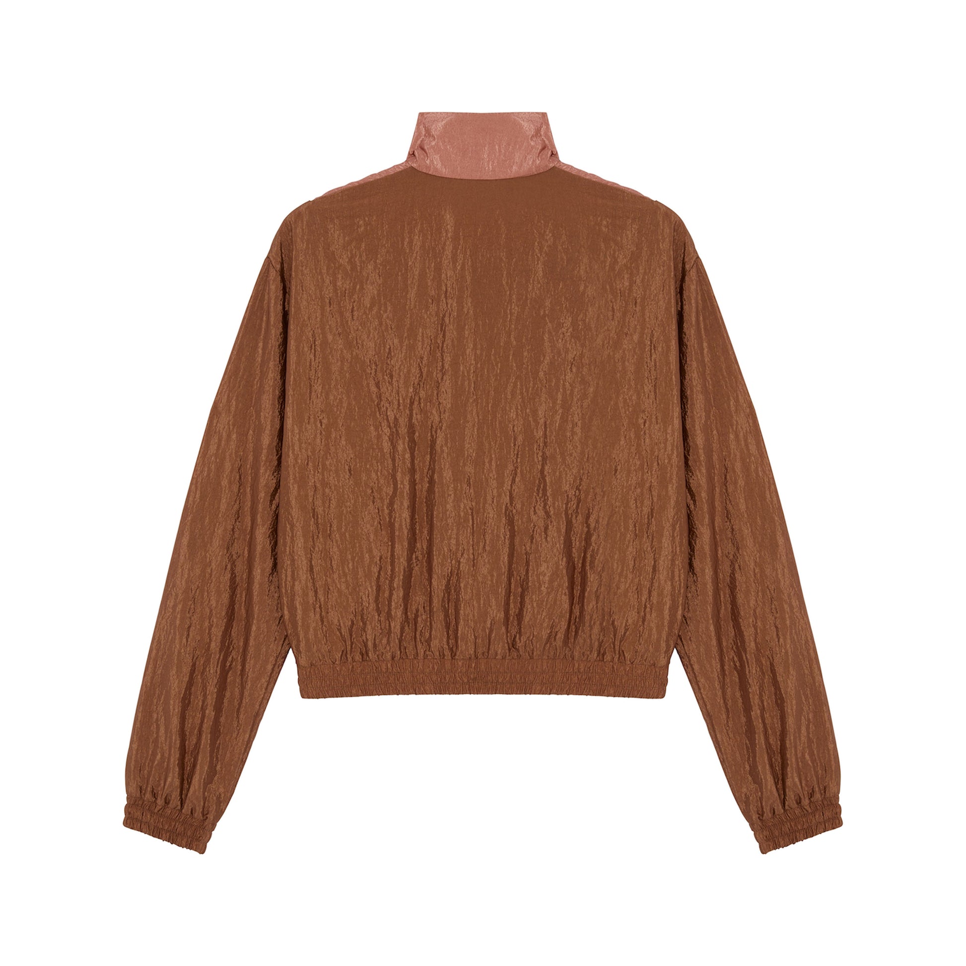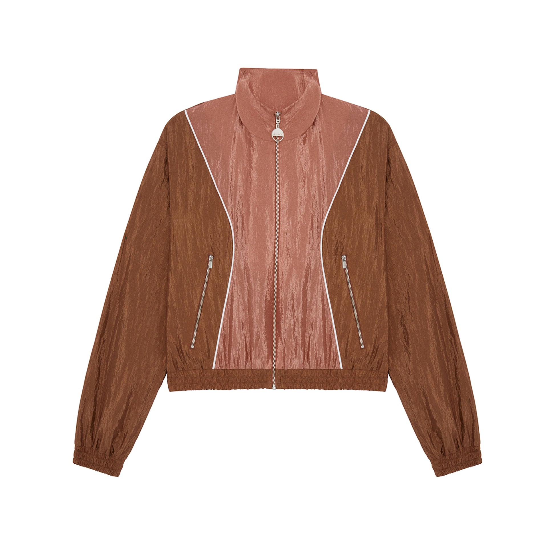 The Leela Track Top features two tonal shades of nylon in a slightly cropped silhouette. It has an elasticated waistband and cuffs, a standing collar, and an exposed zip finished with Ahluwalia’s signature round puller. The soft colour palette reflects tenderness, hope, and the calm that love brings.
