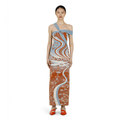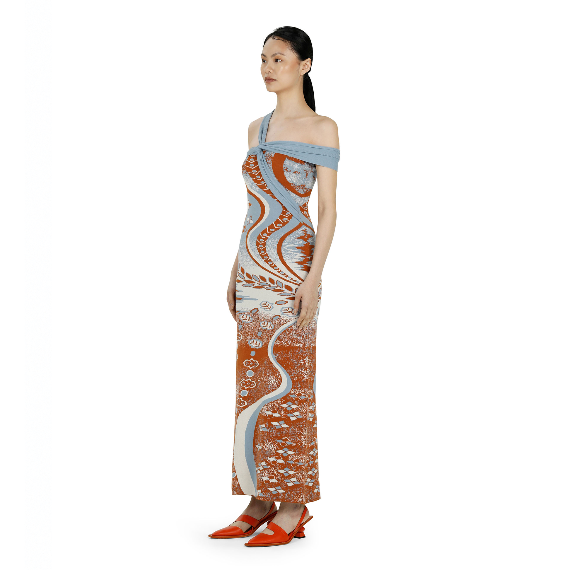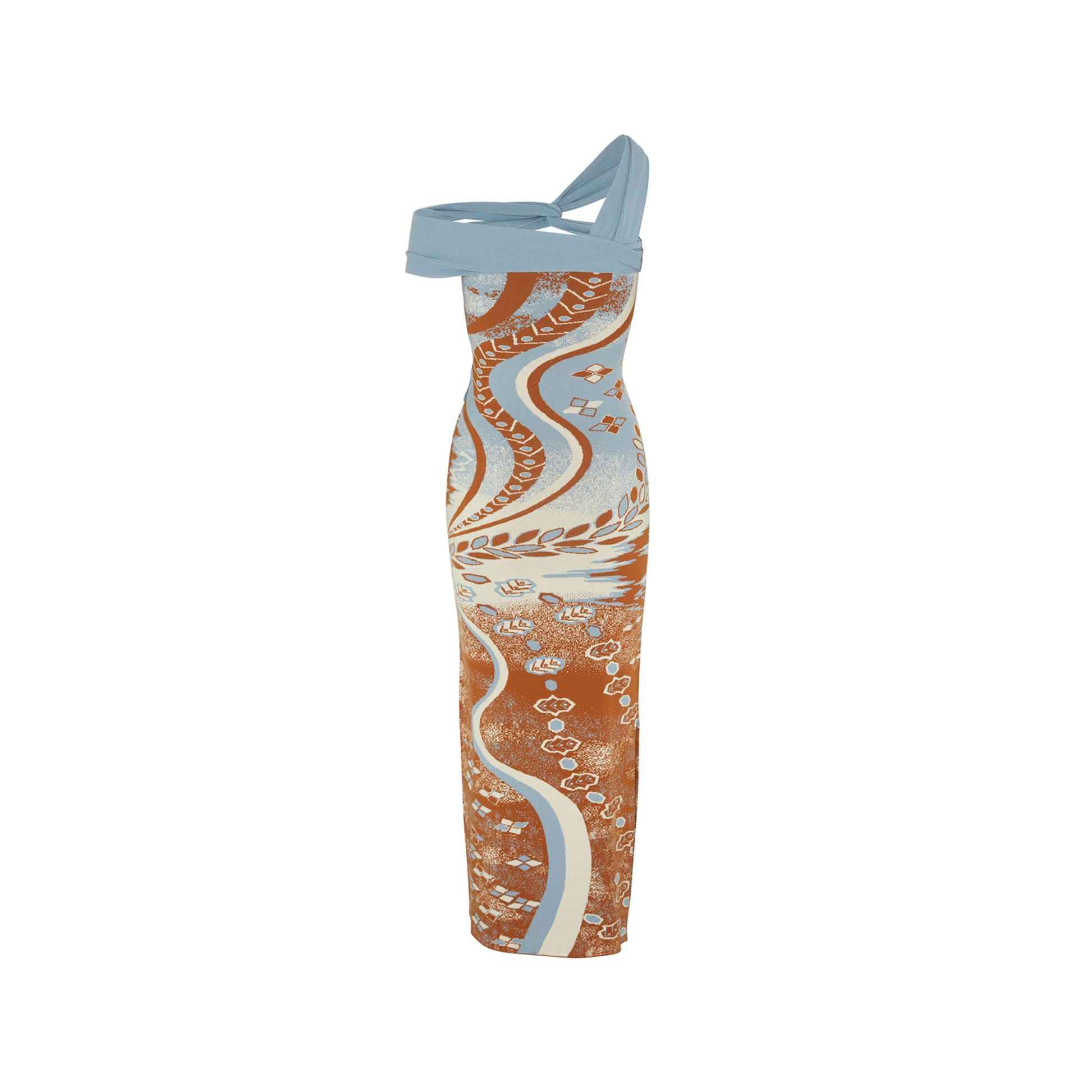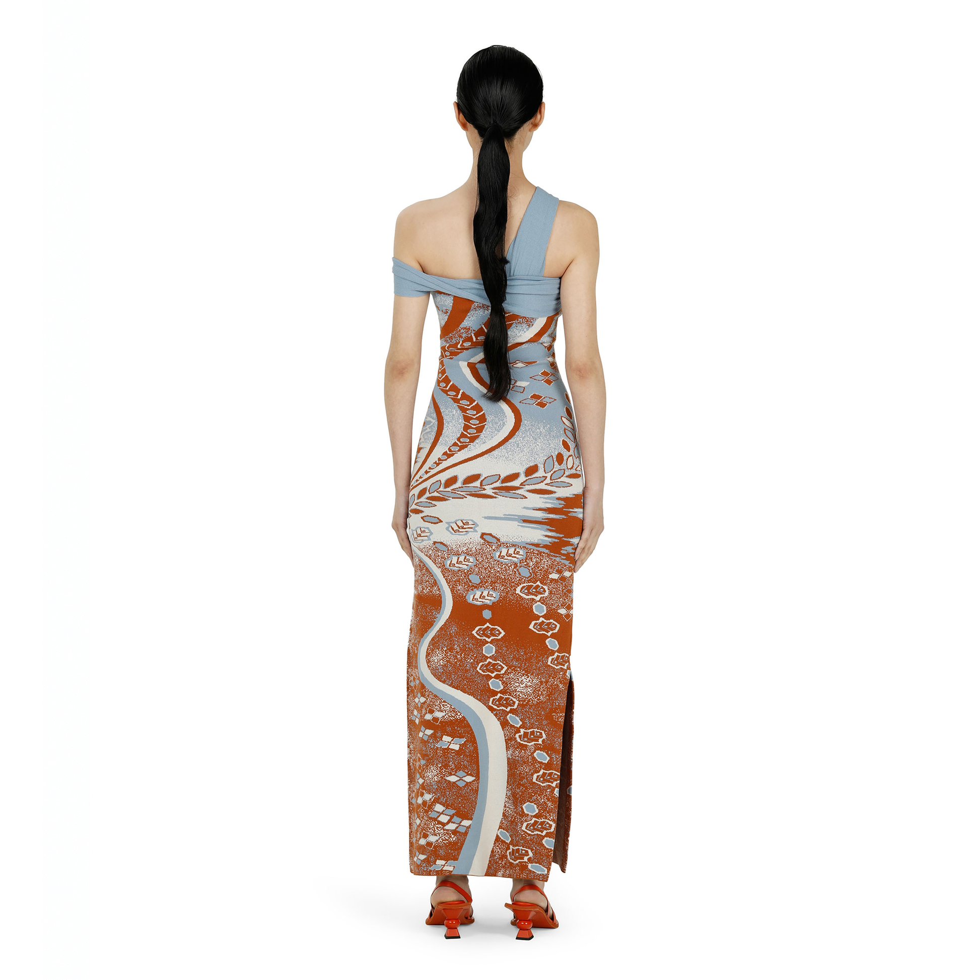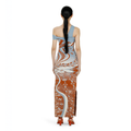 Woven from a jacquard of blue, ivory and brown viscose yarns, the Orisa Knitted Maxi Dress draws inspiration from romantic Bollywood films, Indian miniature paintings, and the intricate patterns of Nigerian geles worn at weddings. The twisted strap detail echoes the collection’s theme of intimacy—twisting entities together.