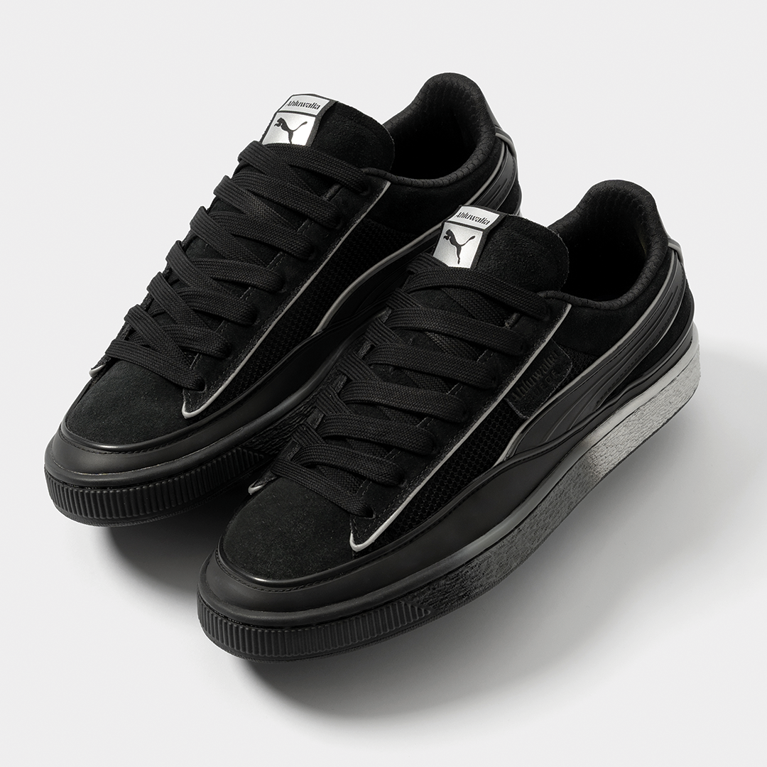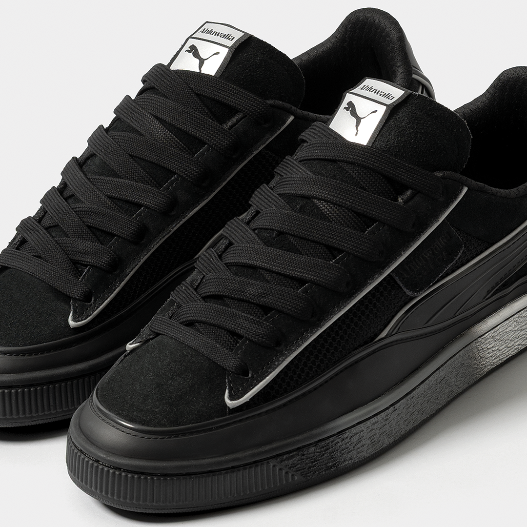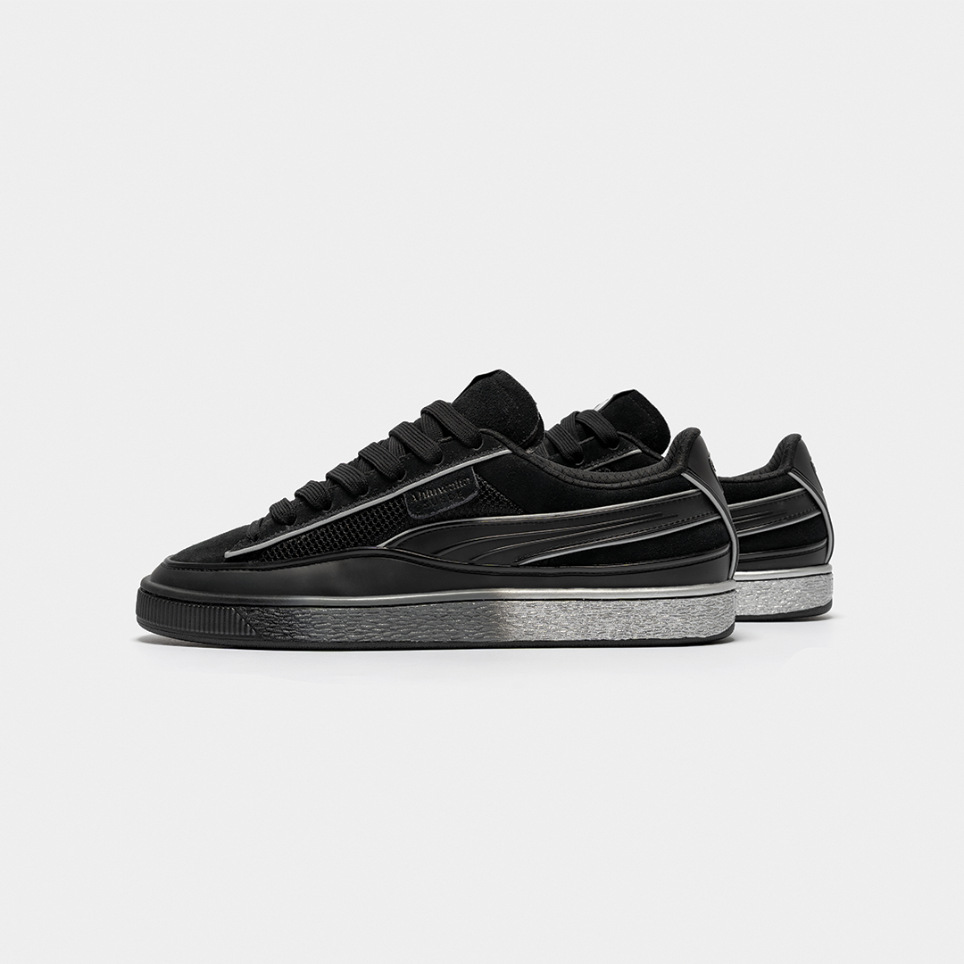 The PUMA Suede Classic by Ahluwalia is made from premium leather and features a subtle ombre metallic midsole with a monotone black-and-silver palette. TPU Formstrip and mudguard overlays add functional detailing, while co-branding on the tongue and Suede tab completes the design.