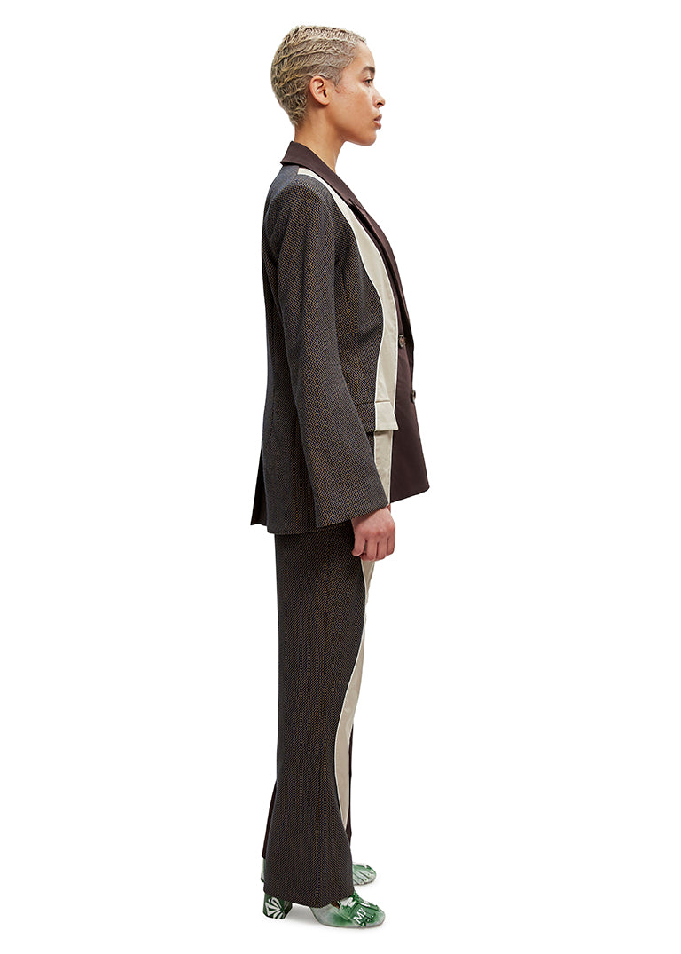 A new shape for SS22 cut from up-cycled Italian fabrics, the Expression Trousers are softly tailored for maximum comfort and wearability. The contrasting wave panels are finished with a clean line of Ecru piping whilst the trousers also feature jet pockets, bound seams and a dropped back-waistband.