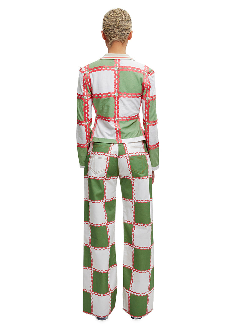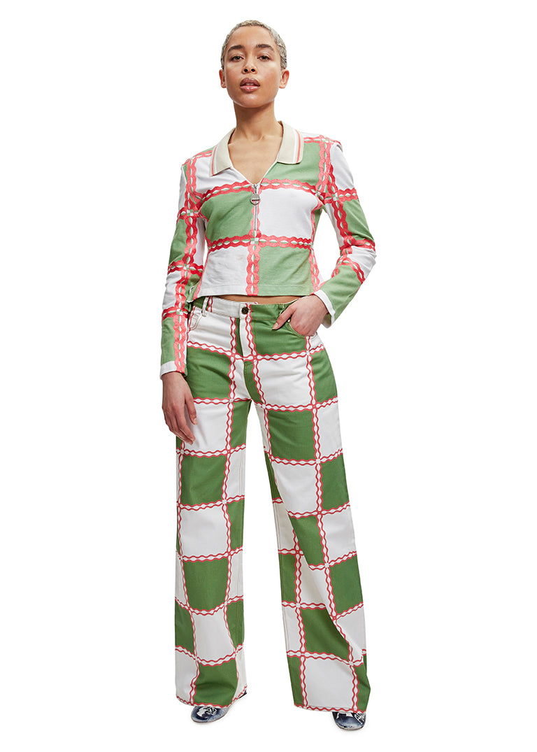 The Checkerboard print long-sleeved Jade polo top is crafted from 100% organic cotton piqué in tones of green and off-white, accentuated by a Georgia peach chain stitch. The Top is cut to finish above the hip and features Ahluwalia hardware, a half-zip up at the bust and a contrast beige, ribbed collar.