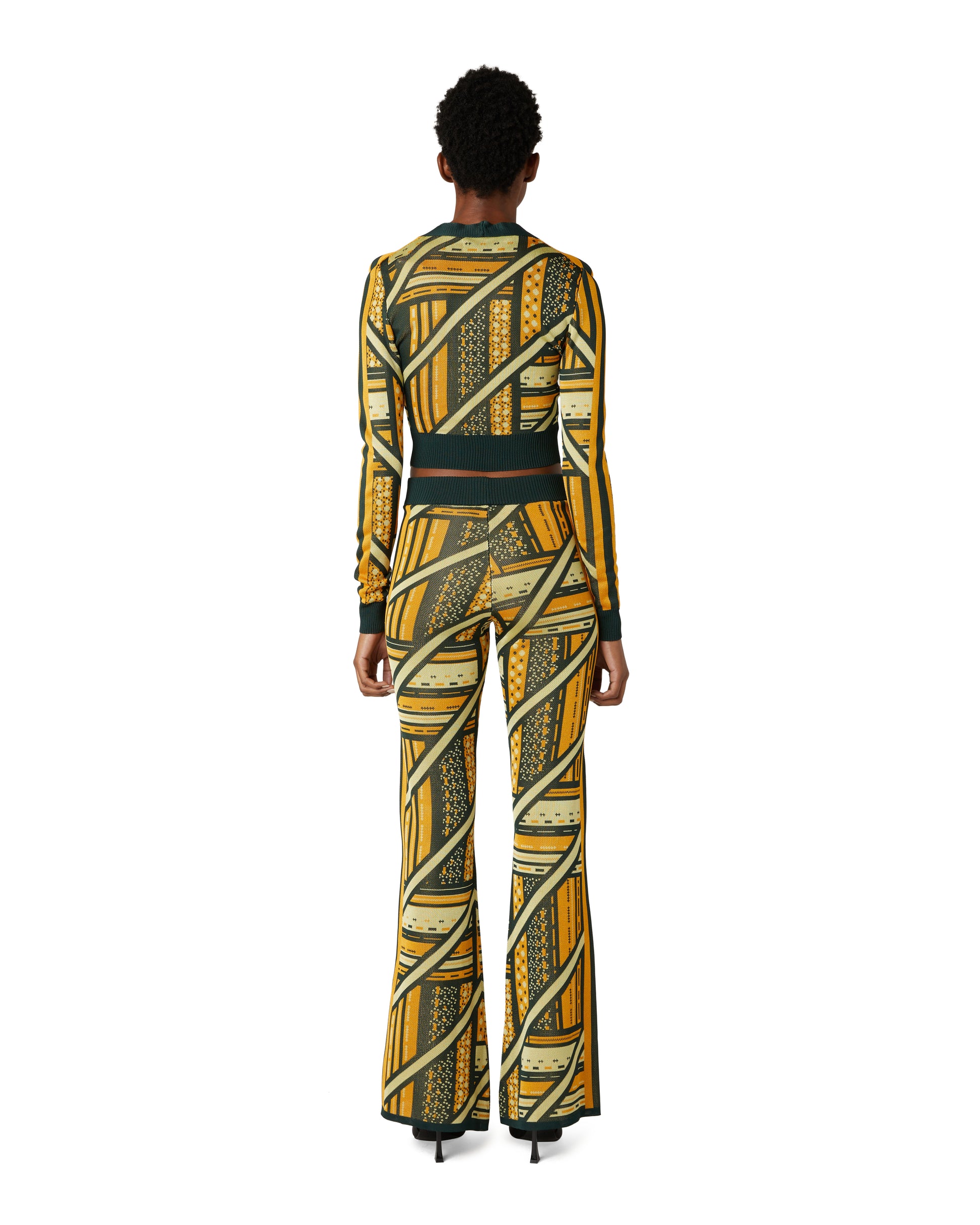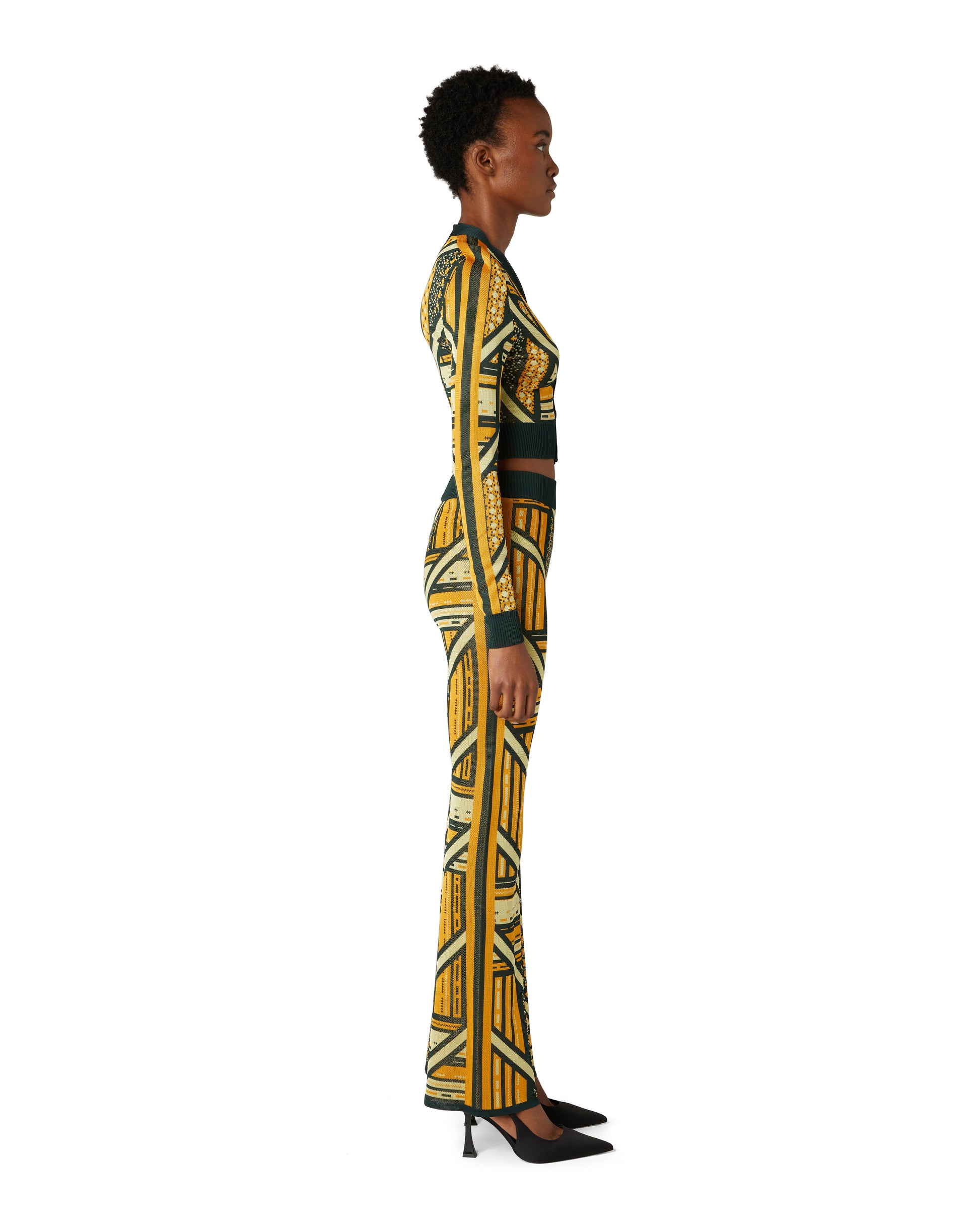 Fashioned from 100% viscose yarn in various segments of block colours. The Ayo Knit trousers feature an exaggerated ribbed waistband, contrasting side panels and a wide leg for a fit to flared look.