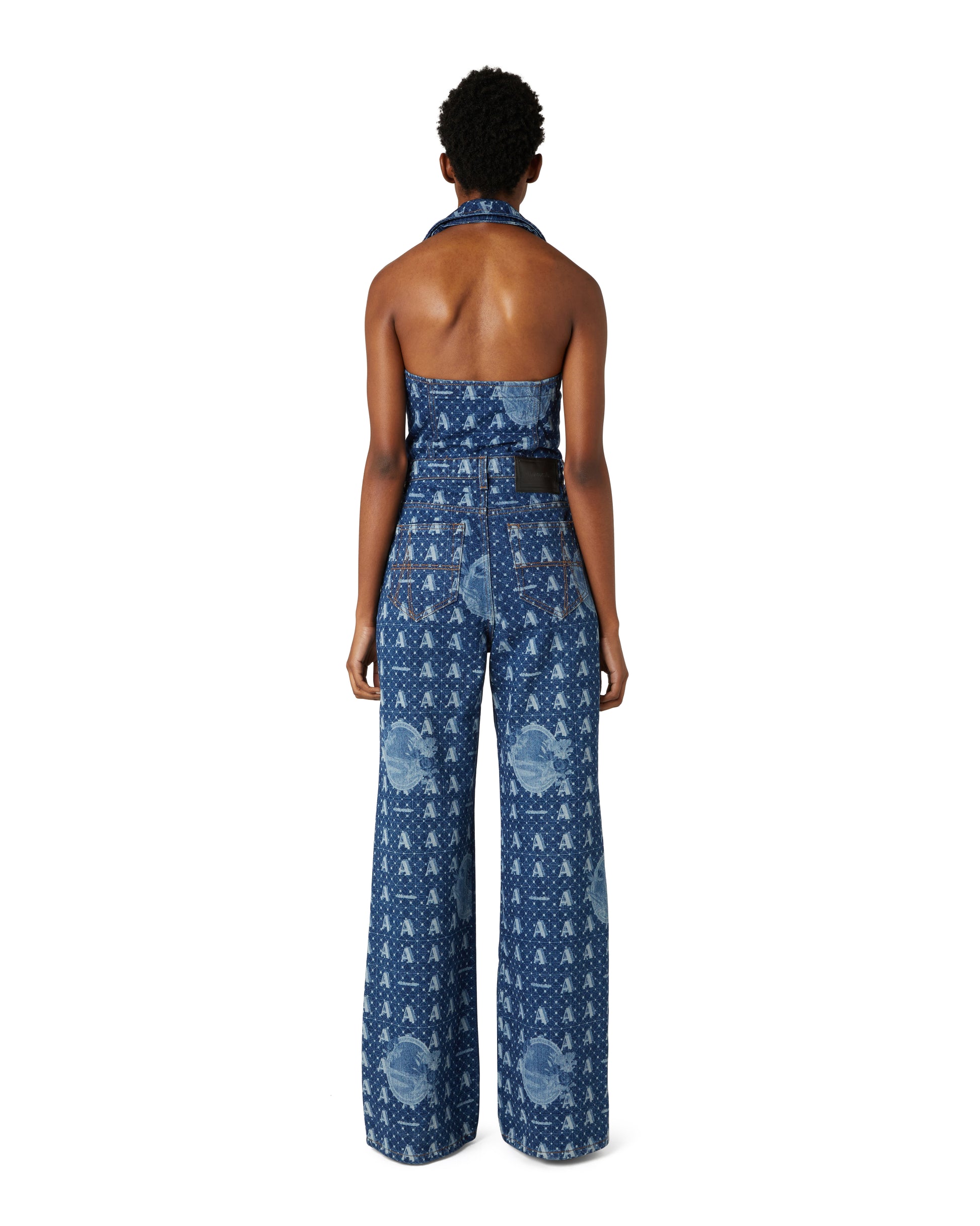 Taking a cue from the iconic 70's era, the Mombasa Denim Jumpsuit is cut from 100% organic denim with the all-over motif & laser etching, branded hardware, topstitching and a wide leg.