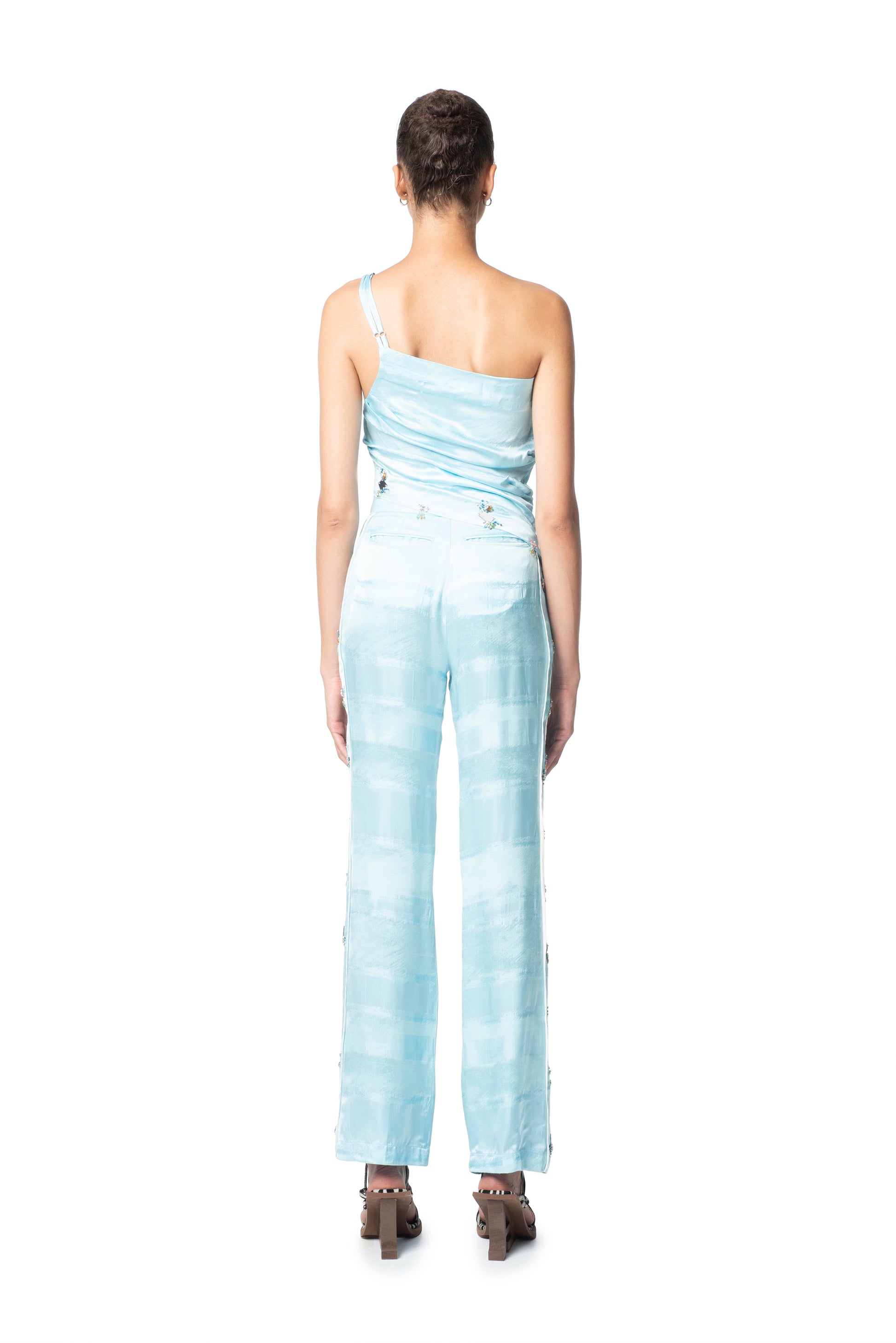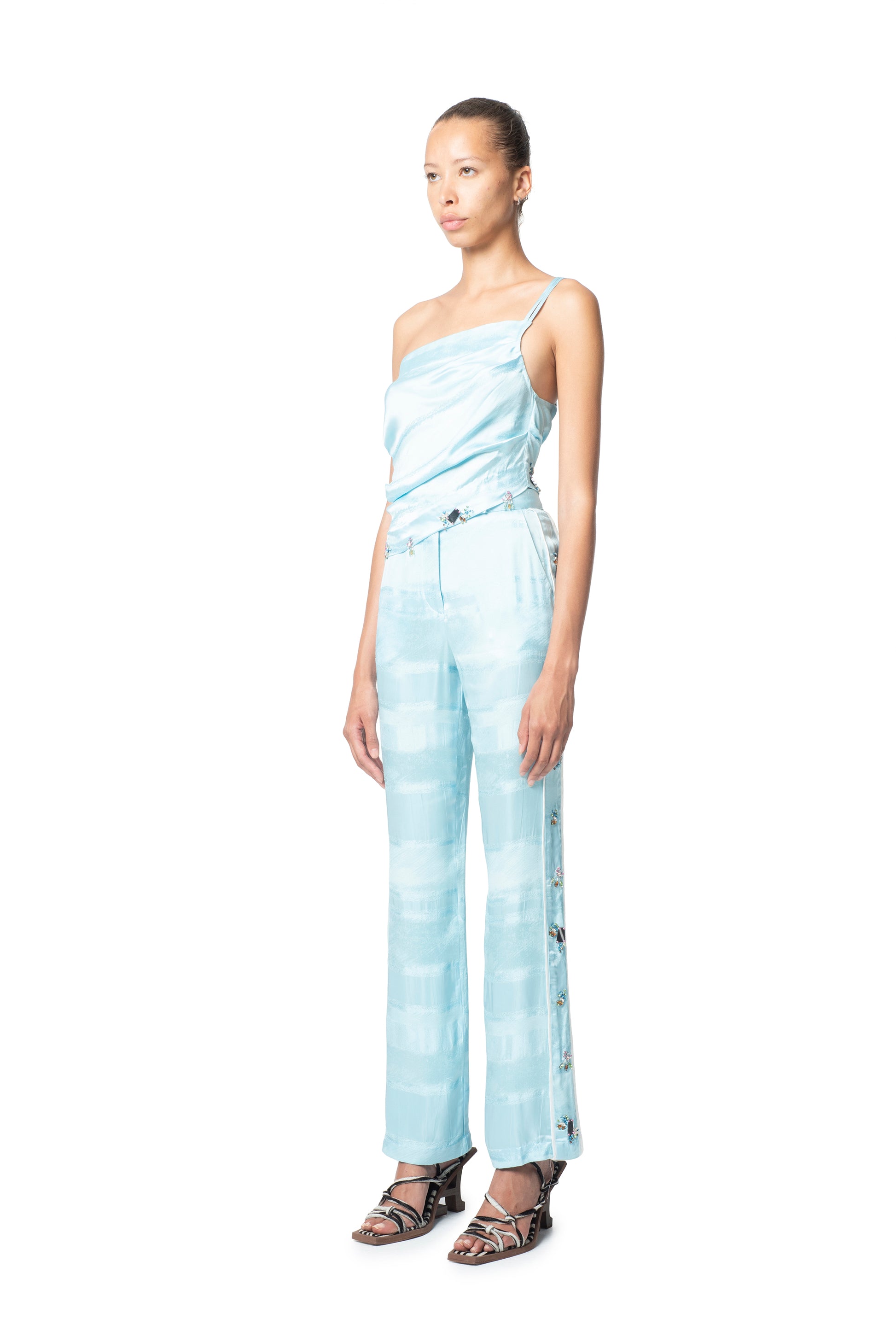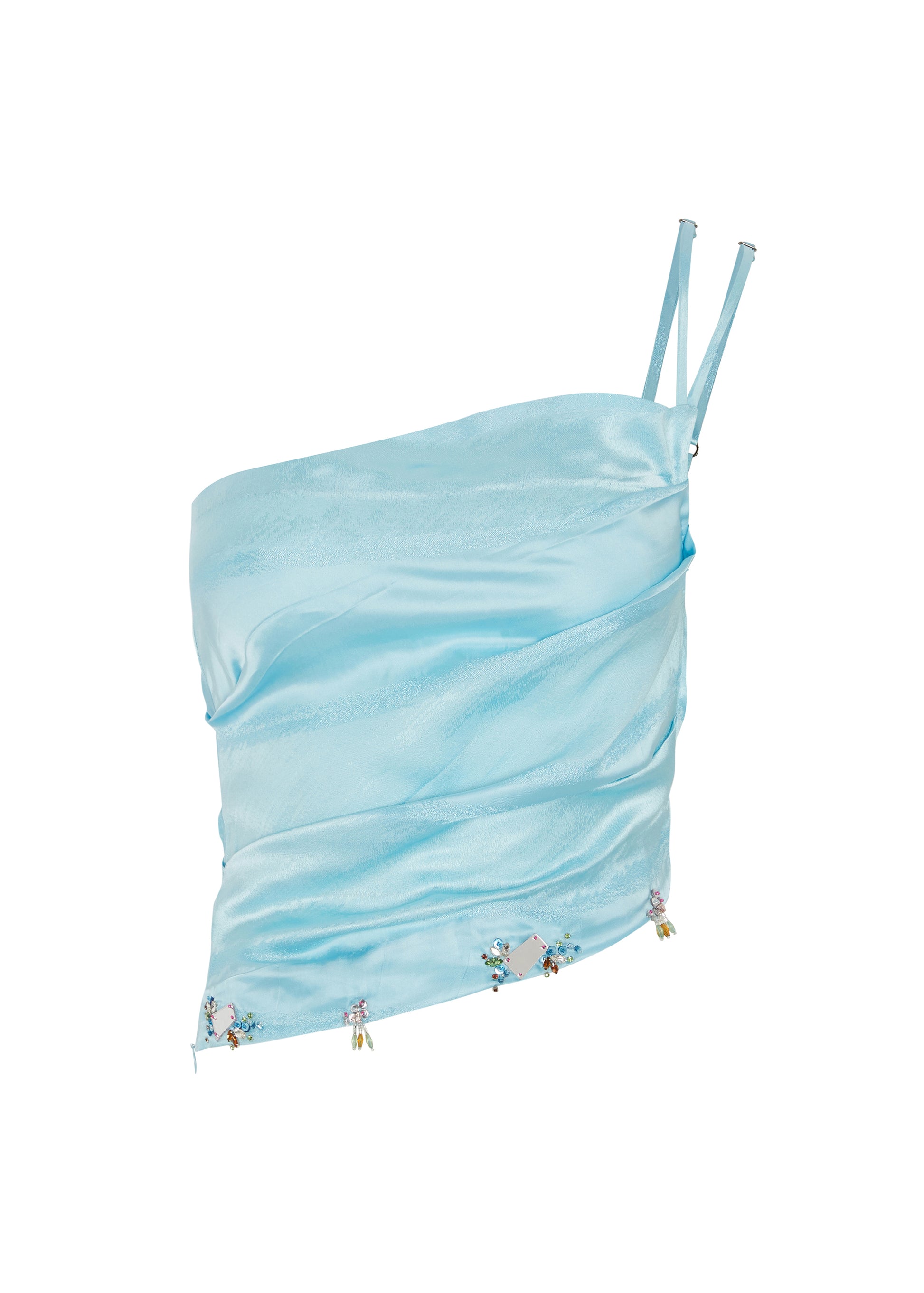 The Bnaebi Embellished top features features embellished motifs inspired elements found in flowers and plants. The gems and mirrors incorporated symbolise the act of reflecting and perceiving things from a fresh perspective, algining with the collections theme, 'Acknowledgements'. The drape of the top is inspired by Indian saris.