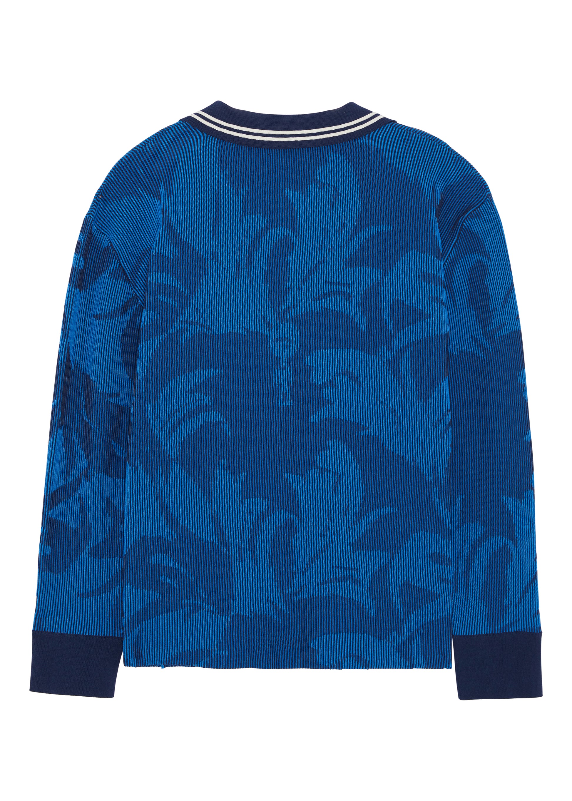 The Buju knitted polo is knitted using an illusion technique and made from ECOVERO™ viscose yarn. The Buju Polo features artwork with elements inspired by shells and flowers, which transforms in appearance as one moves around the garment.