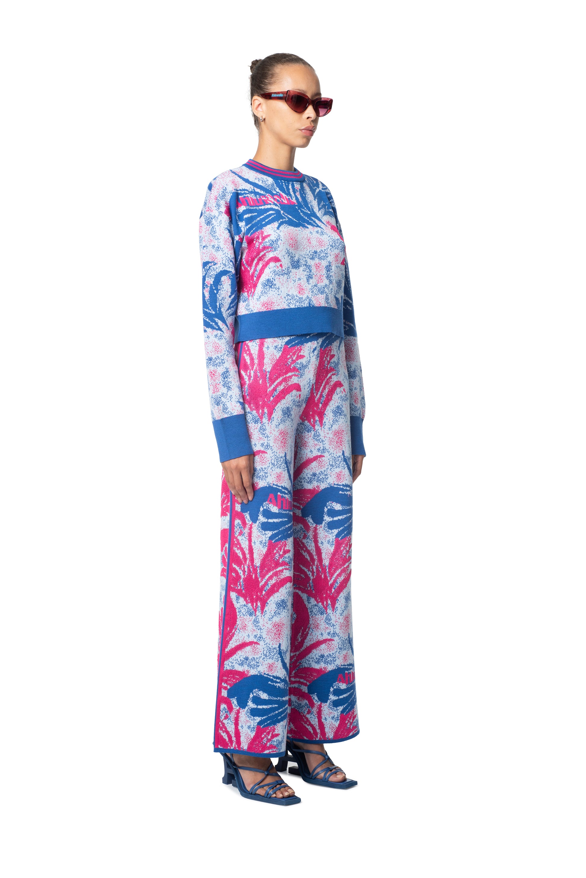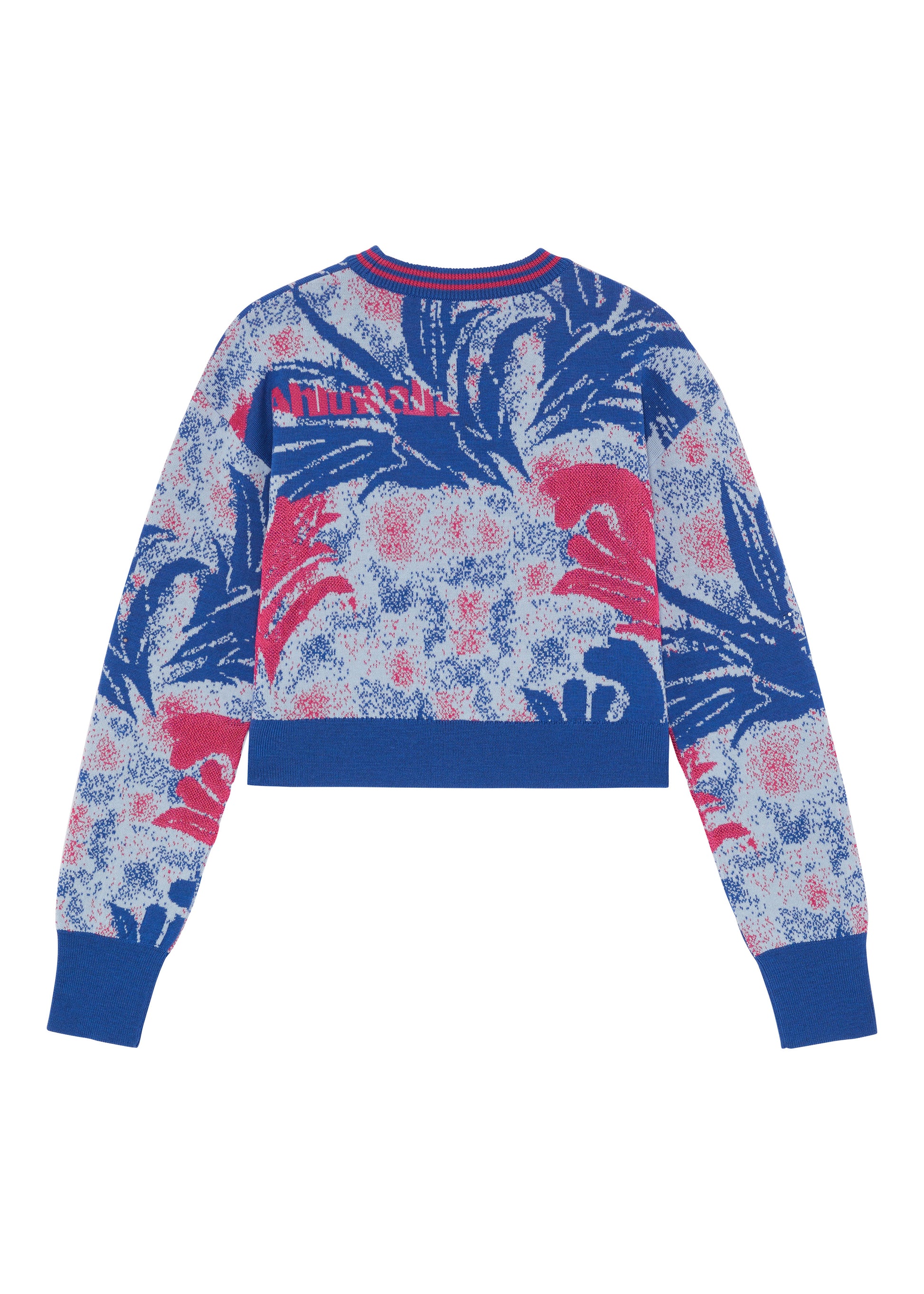 The Kiara knitted Crew features floral motifs layered with a gradient speckle effect, knitted with Ecovero viscose yarns. Within these motifs, the name 'Ahluwalia' is layered, adding a sense of depth and movement to the design.