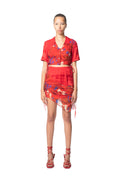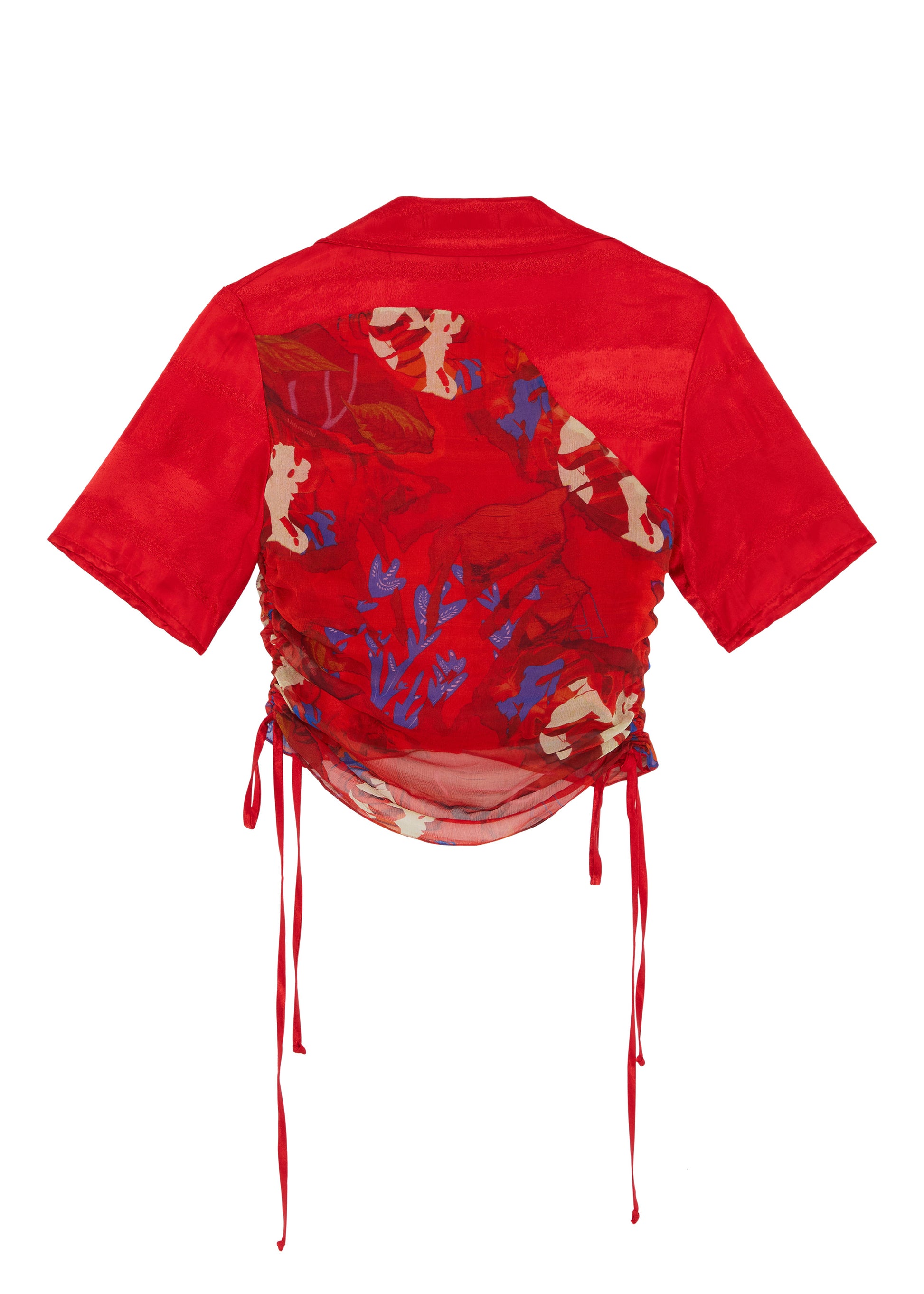 The Priya top features printed sheer overlaid panels crafted from translucent recycled viscose, symbolically reflecting the intricate and multifaceted nature of womanhood. It features this season's all-over print, encompassing brush strokes and typography. Discreetly interwoven within the design, you'll find 'Ahluwalia' hidden behind torn sections of plant and shell motifs. The overlaid panels are adjustable due to the drawstrings featured on either side.