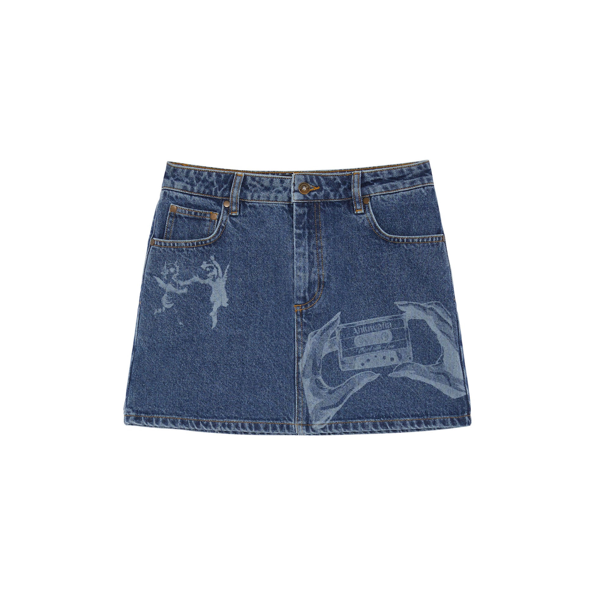 The denim mini skirt features elements of this season’s ‘Vinyl’ graphic lasered on the front, inspired by the act of creating mixtapes for the ones you love. Black and Asian-inspired cherubs are also lasered onto the front, with the Ahluwalia logo discreetly placed on the back hem. Made from recycled denim.